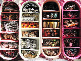 More bracelets are sorted and kept free of tangling in vintage hoisery keepers....